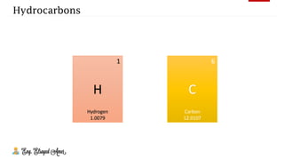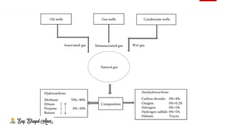 The document provides an overview of natural gas and hydrocarbons, including their composition, states (gas, liquid, solid), and various uses in industries such as fuel and chemical production. It also discusses the classification of hydrocarbons, basic properties of common paraffin hydrocarbons, and structural isomers. Additionally, it mentions the types of reservoir fluids associated with hydrocarbons.