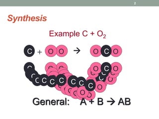 1. The document describes different types of chemical reactions including synthesis, decomposition, single displacement, double displacement, combustion, acid-base, and neutralization reactions.