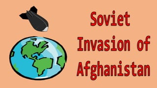 The Soviet Union invaded Afghanistan in 1979 to prop up the communist government that came to power after a 1978 revolution. However, many Afghans opposed communist rule and fought back as mujahedeen rebels in a civil war. The Soviet invasion was intended to ensure communist control and give the Soviets access to oil, but they faced guerrilla warfare tactics from the mujahedeen. After 10 years of fighting, the costly and unwinnable war became a disaster for the Soviets similar to the US in Vietnam, and Soviet troops withdrew in 1989.