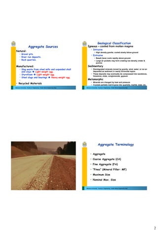 This document provides information on aggregates used in construction, including their definition, sources, classification, properties, and specific gravity tests. It defines aggregates as crushed stone, gravel, sand or other particulate materials used in construction. The key points made are: