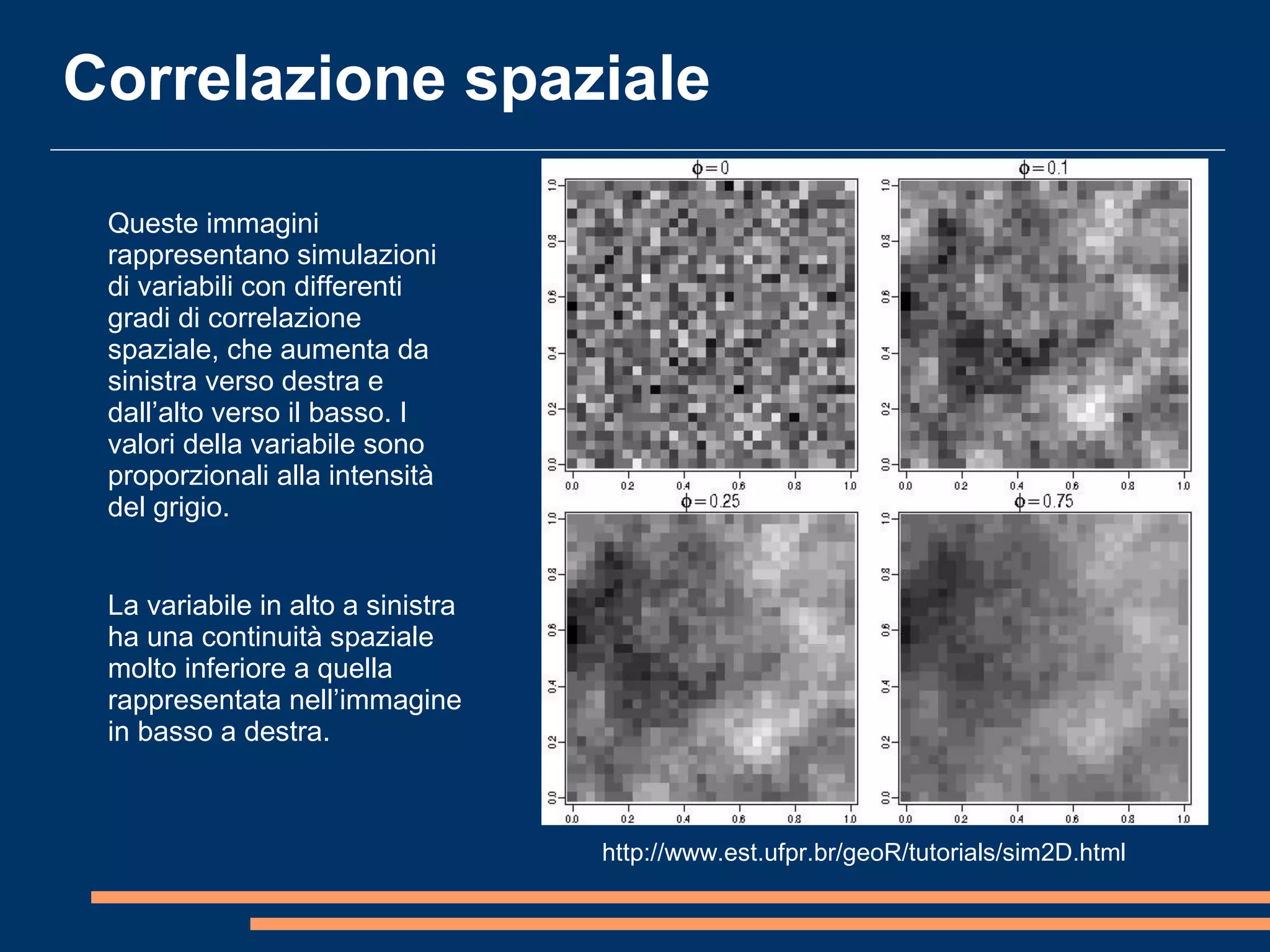 Il documento analizza la correlazione e l'anisotropia spaziale in variabili geostatistiche, mostrando come la continuità spaziale e le differenze di varianza siano influenzate dalla separazione tra le osservazioni. Vengono presentati strumenti e metodi come il variogramma e tecniche di kriging, evidenziando l'importanza di considerare le proprietà statistiche nelle analisi spaziali. Infine, si discutono modelli teorici per adattare i dati sperimentali e metodi di cokriging per migliorare le stime attraverso variabili correlate.