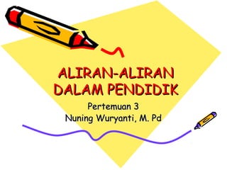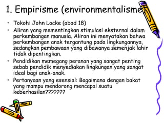 Dokumen ini membahas empat aliran dalam pendidikan: empirisme, nativisme, naturalisme, dan konvergensi, masing-masing dengan pandangan berbeda tentang pengaruh lingkungan dan bawaan pada perkembangan anak. Empirisme menekankan pentingnya lingkungan, nativisme menekankan pembawaan sejak lahir, naturalisme menganggap alam sebagai guru ideal, dan konvergensi mengakui pengaruh gabungan dari kedua faktor tersebut. Diskusi lanjutan ditujukan untuk mengevaluasi relevansi aliran ini dalam konteks pendidikan saat ini dan mencari konsep pendidikan ideal bagi perkembangan anak.