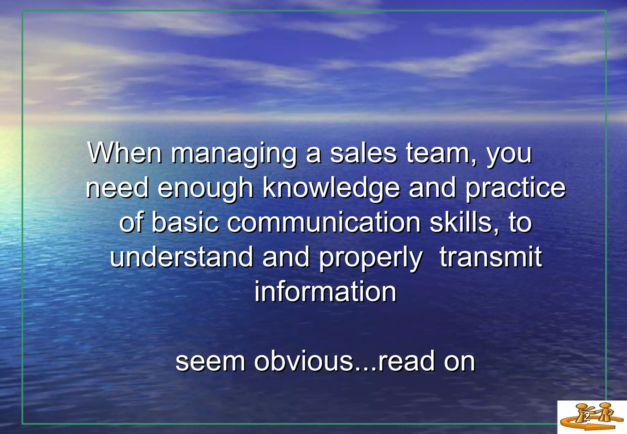 The document provides tips for improving basic communication skills as a new sales manager. It identifies three key areas to focus on: listening, writing, and speaking. For listening, it recommends focusing intently on what is being said and body language, and practicing listening exercises. For writing, it suggests having a clear outcome, being enthusiastic, using bullet points and short sentences. For speaking, it notes the importance of the way messages are delivered and joining communication workshops or speakers groups to practice public speaking skills. Developing strong communication skills is important for success as a new sales manager.