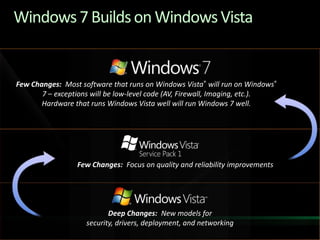This document summarizes key points about application compatibility between Windows versions. Most software that runs on Windows Vista will also run on Windows 7, with some exceptions for low-level code. Hardware compatible with Vista will also generally work with 7. While there are few surface-level changes, under the hood there are deeper changes to security, drivers, deployment and networking. The document outlines specific compatibility issues applications may face when moving from XP to 7 or Vista to 7, such as new folder locations and changes due to User Account Control. It provides recommendations on using new Windows 7 APIs and features to enhance applications.