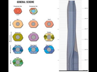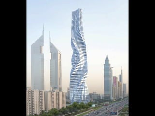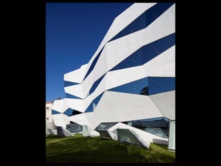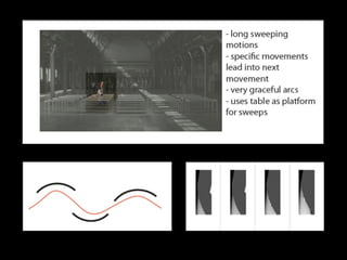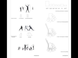 This document discusses the shared qualities and concerns of dance and architecture. It notes that dance is architecture in motion, with the human body producing an intangible kinesphere of potential movement like an icosahedron. Both dance and architecture are concerned with practices of space - for dancers, choreography constructs spatial dimensions through gesture, while architects construct habitation through emerging forms. The document examines how choreographic elements like algorithms, objects and constructions are analogous to architectural design processes.
