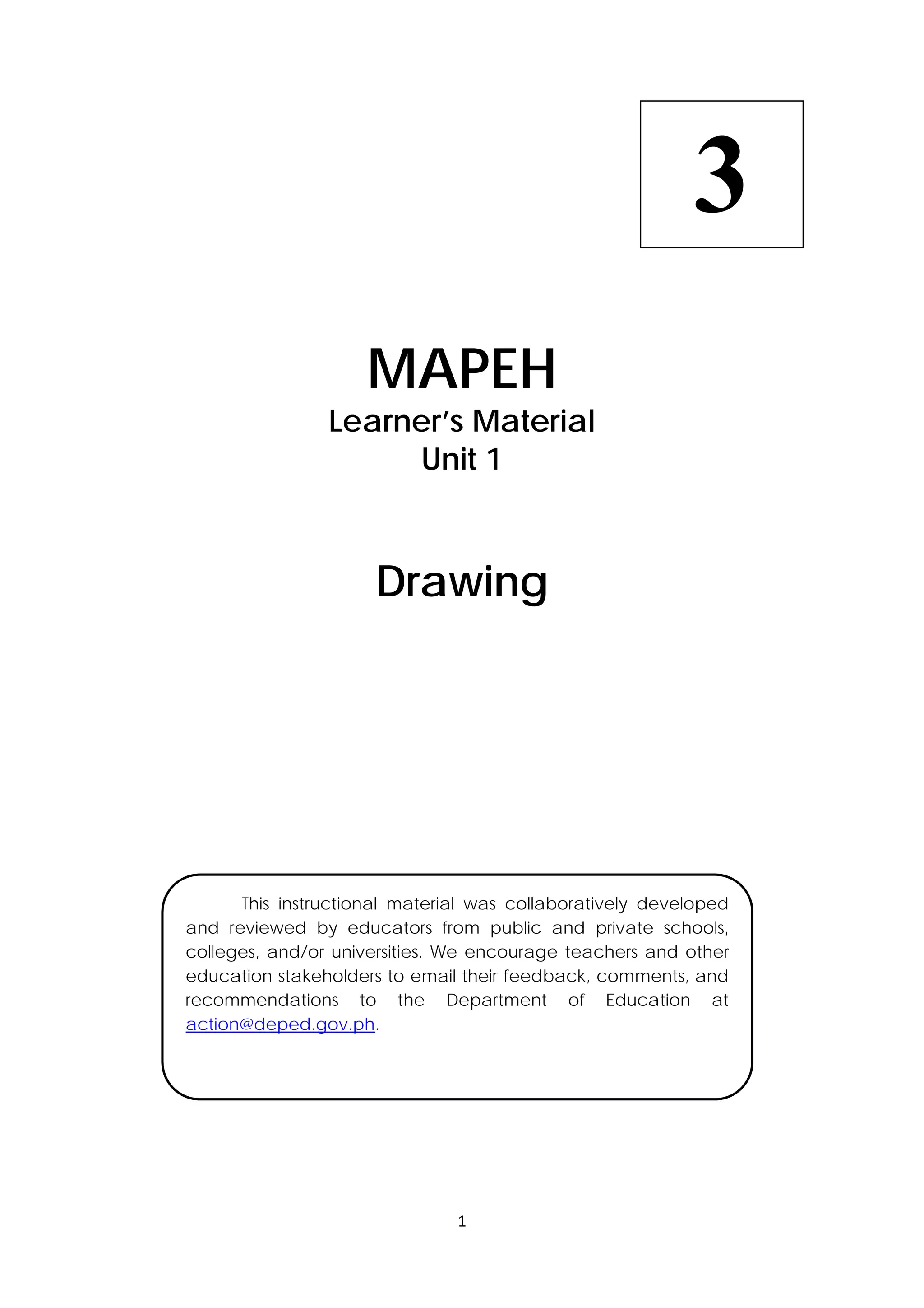 This document provides a learner's material for a MAPEH (Music, Arts, Physical Education, and Health) unit on drawing. It includes 8 drawing lessons that teach students about different types of lines, creating perspective through object size, shading techniques, landscape composition, and sketching occupations. The material was developed by Philippine educators to provide instruction on visual art concepts.