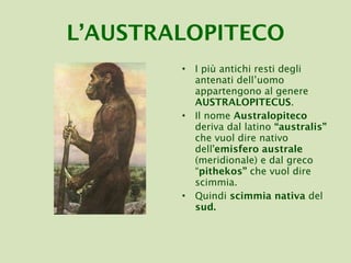 L'australopiteco è considerato uno dei primi ominidi e visse in Africa orientale e meridionale da 5-4 milioni di anni fa. Questo genere di scimmia aveva caratteristiche fisiche come un cervello piccolo, un'altezza di 100-130 cm e una dieta variegata, nutrendosi principalmente di vegetali. Uno degli esemplari più noti è Lucy, un esemplare di australopithecus afarensis trovato in Etiopia nel 1974.