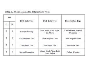 The document discusses several digital avionics data bus systems used for exchanging data between aircraft subsystems. It describes the Ethernet, MIL-STD-1553, and ARINC 429/629 bus protocols. Ethernet uses CSMA/CD access and supports data rates up to 1 Gbps. MIL-STD-1553 is a time division multiplex bus that operates at 1 Mbps. ARINC 429 is a low-speed unidirectional bus, while ARINC 629 is a higher speed bidirectional bus that uses carrier sense multiple access.