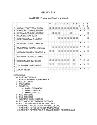 This document contains attendance and grade information for students in an Art class. It lists 12 students and shows their attendance and completion of exercises numbered 0-12 with checkmarks. The exercises involve topics like curves, ellipses, polyhedrons, symmetry, and modular patterns. The due date for exercises is May 10th and the exam is May 14th.