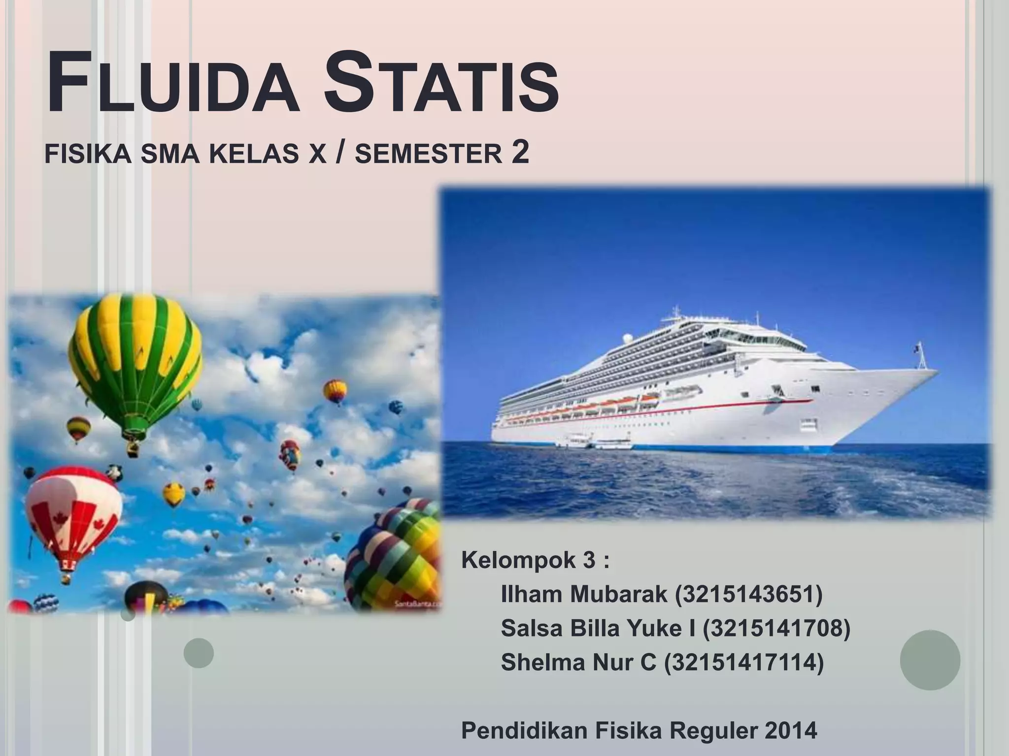 Dokumen ini membahas tentang konsep fluida statis dalam fisika, termasuk hukum-hukum seperti hukum Pascal dan Archimedes, serta sifat-sifat fisika fluida seperti tekanan, viskositas, dan tegangan permukaan. Latihan soal dan contoh aplikasi hukum-hukum tersebut disertakan untuk membantu pemahaman. Kompetensi yang dibahas bertujuan untuk meningkatkan pemahaman siswa terhadap perilaku ilmiah dan penerapan hukum fisika dalam kehidupan sehari-hari.