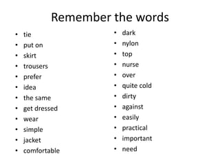 The document discusses uniforms from two perspectives. The first perspective is from a student who likes their school uniform because it is easy to get dressed in the morning and everyone looks the same, though they dislike the tie and skirt. The second perspective is from someone whose work uniform is uncomfortable because it is white and gets dirty easily in the winter, though they acknowledge uniforms can help others identify workers when help is needed. Overall, the document presents both positive and negative views on uniforms from individuals in school and work settings.
