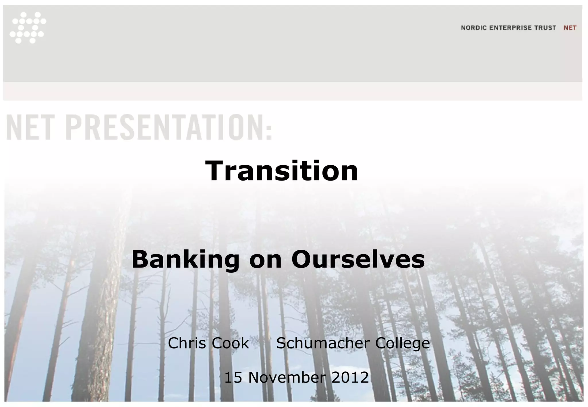 This document discusses alternatives to conventional banking and financing models, including peer-to-peer credit systems, clearing unions, capital partnerships, and energy stocks. It proposes that these systems could help transition economies away from fossil fuels by funding investments in renewable energy and energy efficiency. Specifically, it suggests that a carbon levy could fund an energy pool to invest in renewables and green deals for energy savings. The energy pool would pay out an energy dividend in the form of stock that is returnable to purchase energy, creating a carbon currency based on the intrinsic value of energy.
