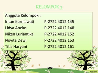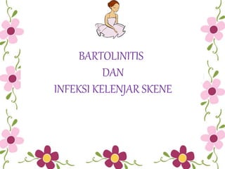 Dokumen ini membahas bartolinitis dan infeksi kelenjar skene, mencakup pengertian, penyebab, gejala, diagnosis, pengobatan, dan pencegahannya. Bartolinitis adalah infeksi pada kelenjar bartolin yang dapat menyebabkan pembengkakan dan nyeri pada alat kelamin wanita, sedangkan infeksi kelenjar skene termasuk kista atau abses yang dapat menimbulkan gejala seperti nyeri uretra. Pengobatan melibatkan antibiotik dan langkah-langkah pencegahan untuk menjaga kesehatan alat kelamin.