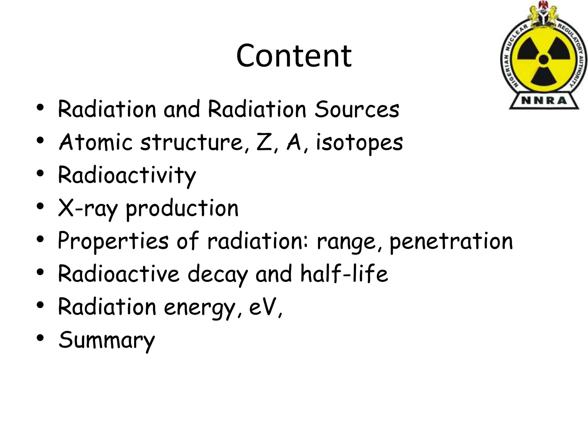 The document provides a comprehensive overview of basic nuclear physics and radioactivity, covering topics such as atomic structure, types of radiation (ionizing and non-ionizing), sources of radiation, and the mechanisms of radioactive decay. Important concepts like half-life, the behavior of isotopes, and the properties of radiation are discussed in detail, alongside practical applications in various fields. It highlights the significance of understanding radiation for radiation safety officers and its implications in daily life and industry.
