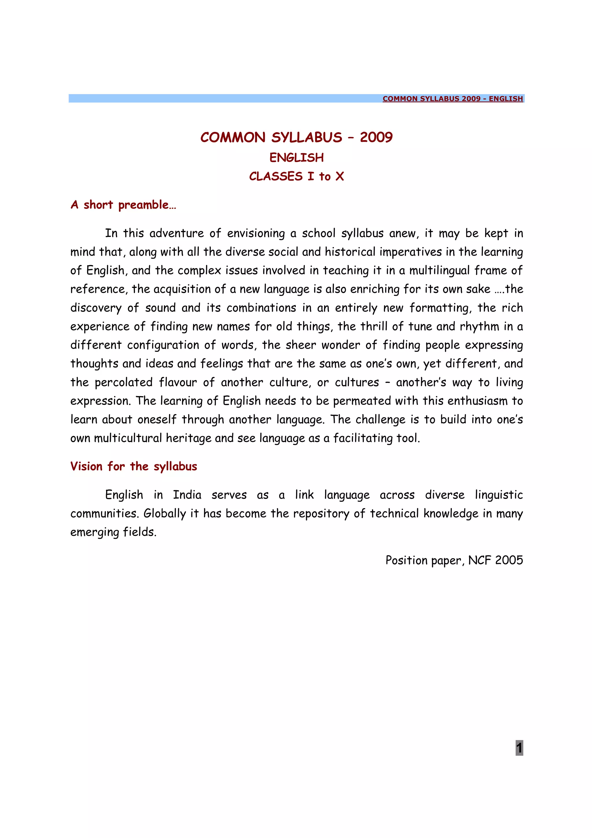 This document outlines the common syllabus for English in classes I to X in India. It discusses the objectives of learning English such as effective communication, participatory learning, and using language as a confidence building strategy. For class I, the focus is on developing basic listening and speaking competencies through activities like singing nursery rhymes, listening to short stories, following simple instructions, recognizing greetings, identifying sounds in words. Students are evaluated based on their ability to perform tasks like singing, responding to questions, identifying rhyming words and discriminating sounds. The gradient of learning increases from classes I to X.