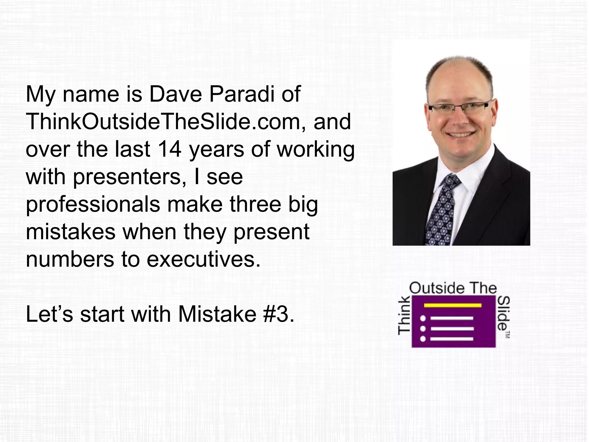 Professionals often make three big mistakes when presenting financial or operational data to executives. The first mistake is including spreadsheets on slides instead of using effective visuals. Spreadsheets are for calculations, not communication. The second mistake is not having clear messages in the presentation. Presentations should be well-structured to take executives from the current situation to the desired outcome. The third mistake is thinking executives love numbers as much as the presenters. Presentations should focus on insights executives can use, not just data. To avoid these mistakes, presenters should use visuals instead of spreadsheets, structure presentations clearly around a main message, and focus on insights rather than numbers alone.