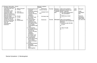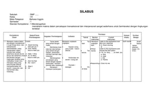 Silabus mata pelajaran Bahasa Inggris kelas VII semester 1 mencakup standar kompetensi mendengarkan dan berbicara. Materi pelajaran meliputi percakapan sehari-hari, instruksi, dan teks fungsional pendek. Kegiatan pembelajaran meliputi mendengarkan, bertanya jawab, bermain peran, dan penilaian dilakukan secara lisan dan tertulis.