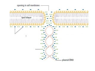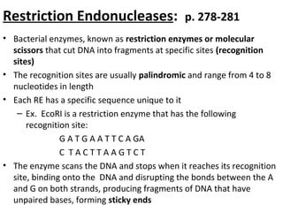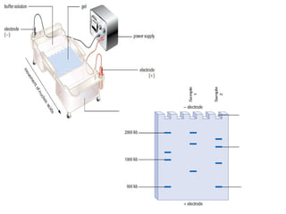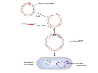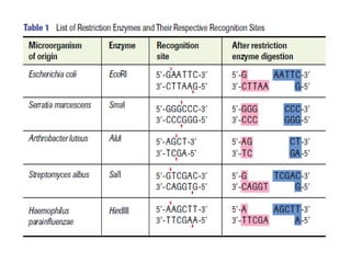 Genetic biotechnology tools use restriction enzymes to cut DNA fragments at specific recognition sites. DNA ligase then joins the fragments together. Gel electrophoresis separates the DNA fragments by size, allowing isolation of the desired gene fragment. Plasmids replicate DNA fragments and are taken up by bacteria through transformation, integrating the foreign DNA. Transformed bacteria are selected by growing on media containing antibiotics that only bacteria with the new plasmid gene can survive on, showing the transformation was successful.