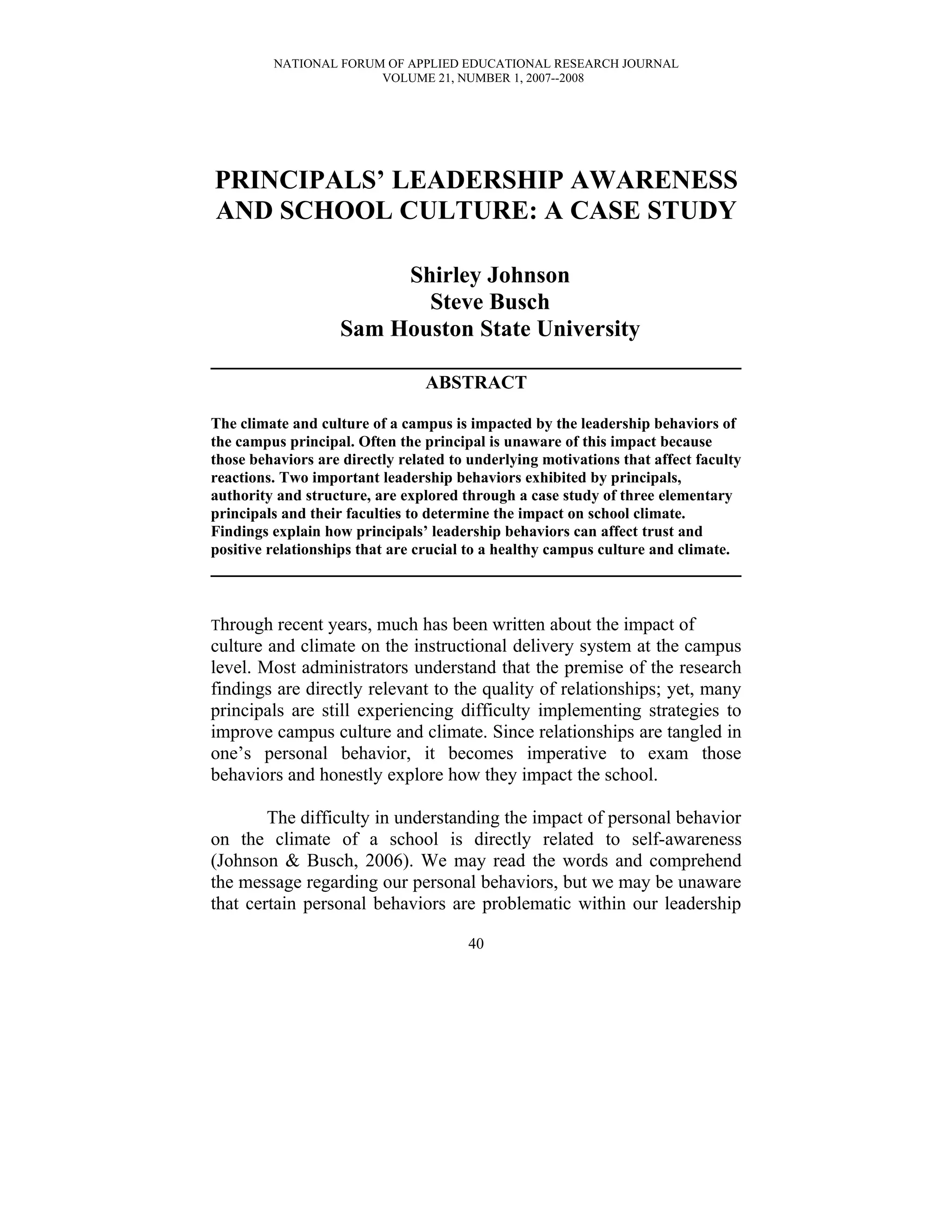 This document summarizes a case study examining the impact of elementary school principals' leadership behaviors on school culture and climate. The study analyzed principals' scores on the Leadership Profile assessment, which evaluates behaviors in building relationships, organization, decision-making, and goal achievement. It found that the principals' scores on structure and authority most influenced teachers' perceptions and the school culture. While principals were usually aware of their own preferred behaviors, they lacked awareness of how behaviors driven by underlying needs and stresses impacted faculty trust and relationships. This highlights the importance of principals understanding how their personal behaviors shape school culture and climate.
