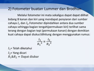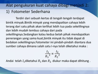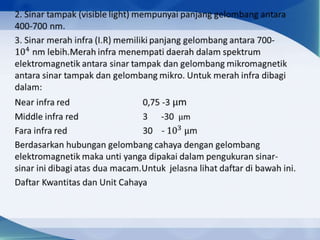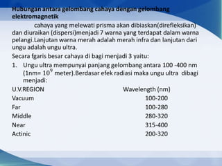 Dokumen tersebut membahas tentang cahaya, termasuk sumber cahaya alami dan buatan, sifat sumber cahaya, satuan-satuan terkait cahaya seperti kuat cahaya dan arus cahaya, alat pengukuran cahaya, serta penggunaan cahaya dalam bidang kedokteran seperti endoskop dan sinar-sinar seperti ungu ultra, merah infra, dan biru.