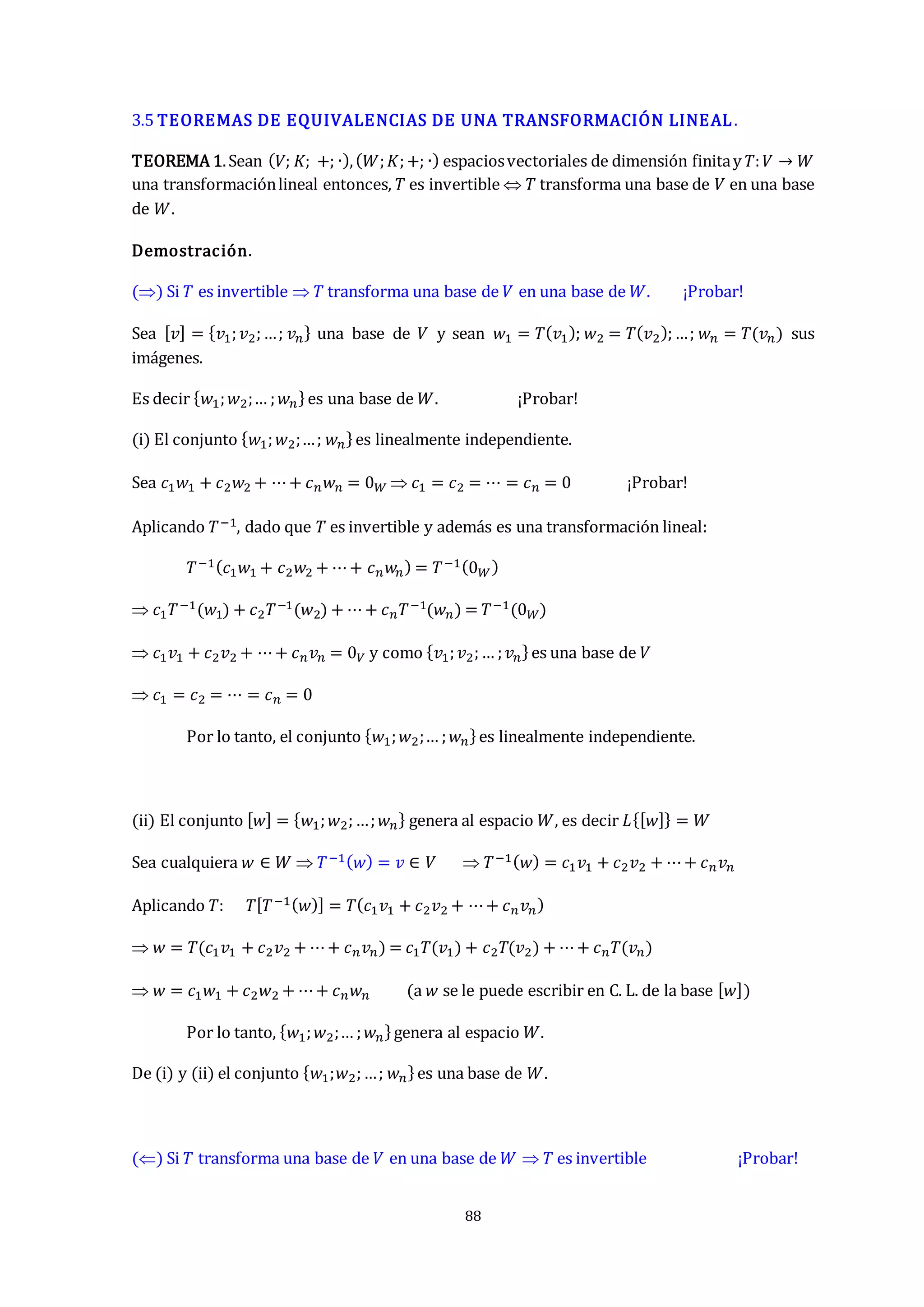 2) A linear transformation T between vector spaces of equal dimension is invertible, injective, surjective, and maps bases to bases. These properties are shown to be equivalent.