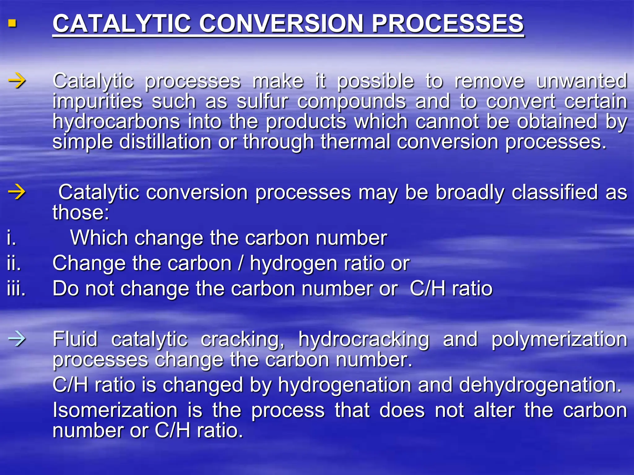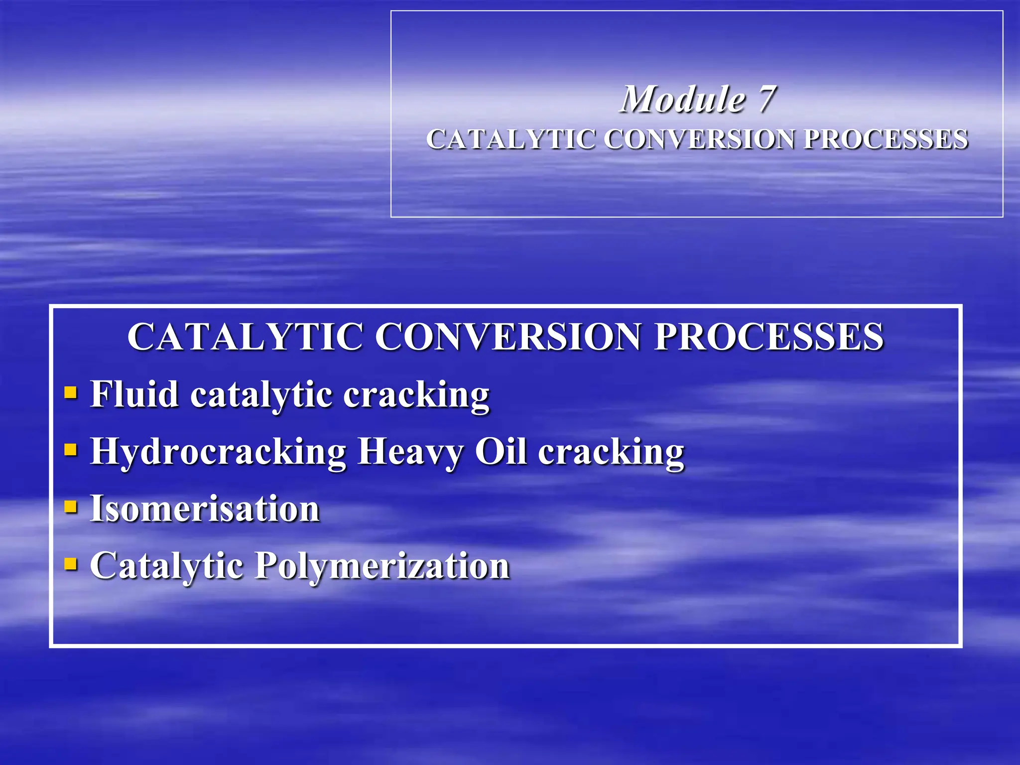 The document provides an overview of various catalytic conversion processes, including fluid catalytic cracking, hydrocracking, isomerization, and catalytic polymerization, used in petroleum refining to transform heavy hydrocarbons into valuable lighter products while removing impurities. It outlines the operational principles, specific applications, and advantages of these processes, emphasizing the versatility and efficiency of technologies like hydrocracking and catalytic cracking. Additionally, it highlights the configurations and energy recovery methods associated with these processes, detailing how they contribute to refining operations.
