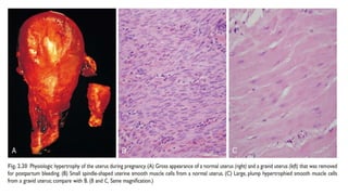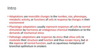 This document summarizes different types of cellular adaptations to stress, including hypertrophy, hyperplasia, atrophy, metaplasia, and cellular aging. It describes hypertrophy as an increase in cell size without cell division. Hyperplasia is an increase in cell number through cell proliferation. Atrophy is a shrinkage in cell size due to loss of cell substance. Metaplasia is the replacement of one adult cell type with another. Cellular aging results from a progressive decline in cell lifespan and function over time.