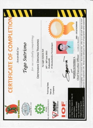 This document is a certificate of employment and certificate of participation for Tego Sutrisno. The certificate of employment details his work for Mesitechmitra Purnabangun from October 2011 to March 2015 as a Material Control Coordinator for an Operation and Maintenance contract in Prabumulih, Sumatra. It thanks him for his efforts and wishes him success. The certificate of participation certifies that Tego Sutrisno successfully completed a Supervisory Management program held by Mesitechmitra Purnabangun from October 21-24, 2012.