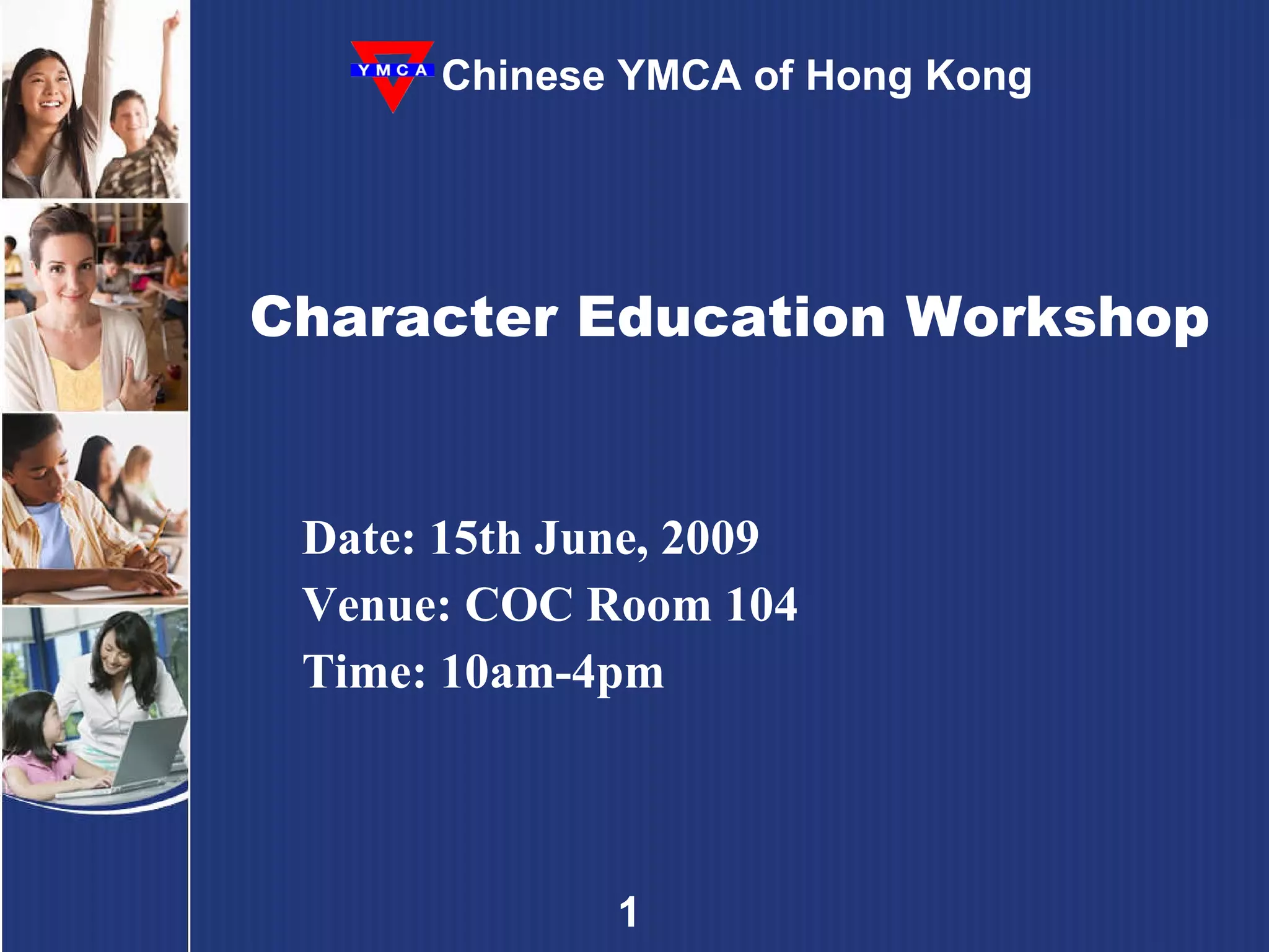 The document summarizes the key points from a character education workshop held by the Chinese YMCA of Hong Kong. It discusses the definition of character and good character, and ways to build character through rules, habits, and positive role models. It also provides an overview of the CHARACTER COUNTS! program, which identifies six pillars of character: trustworthiness, respect, responsibility, fairness, caring, and citizenship. The workshop covered activities and strategies for teaching each of these character traits.