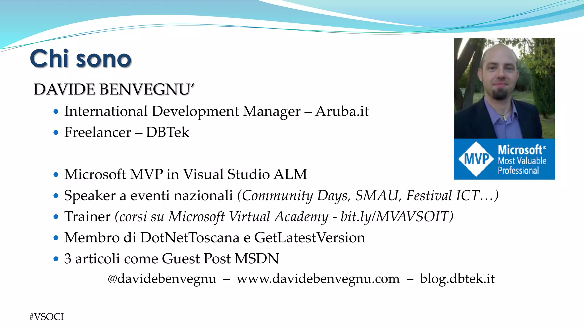 Il documento presenta un'introduzione alla Continuous Integration (CI) e Continuous Delivery (CD) utilizzando Visual Studio Online (VSO), spiegando le modalità operative e i benefici delle costruzioni automatiche. Viene discusso anche l'integrazione con Azure e l'uso del Release Manager as a Service per gestire i processi di deployment. Sono incluse informazioni sulle sessioni formative e sugli eventi in cui l'autore è stato coinvolto.