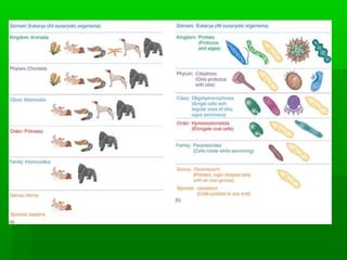 The document discusses the classification of microorganisms according to taxonomy. It describes the taxonomic hierarchy from domain to species and explains how microorganisms are classified into three domains, multiple kingdoms, and assigned binomial nomenclature. The document also reviews different classification systems used for bacteria and archaea based on their physical and genetic characteristics.