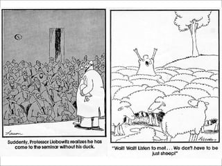 This document provides an overview of key concepts in social psychology related to conformity and obedience. It discusses classic studies on conformity by Sherif and Asch, and on obedience by Milgram. Factors that influence conformity and obedience are explored, such as group size and unanimity. The document also examines theories to explain these behaviors, such as informational and normative influence, and the agentic shift proposed by Milgram to explain why people obey authority figures. Criticisms of classic studies and strategies for resisting social pressure are also summarized.