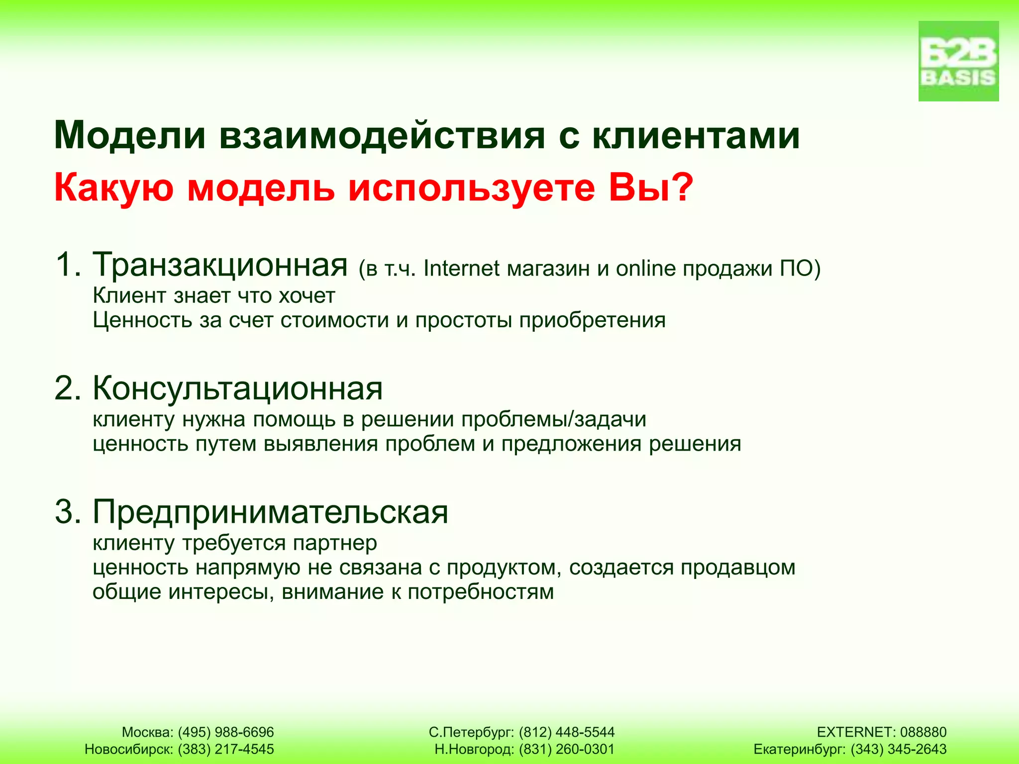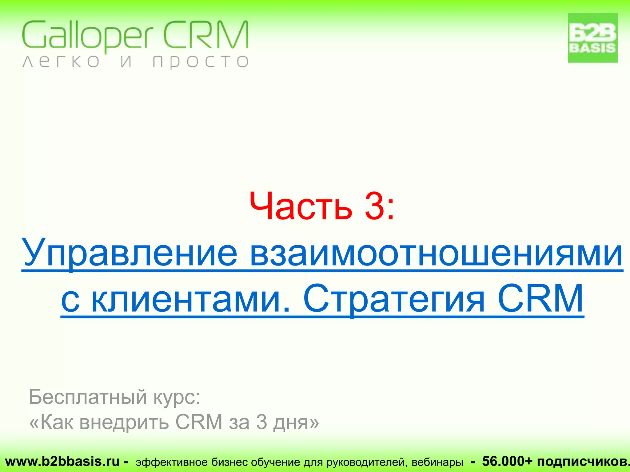 Документ посвящен управлению взаимоотношениями с клиентами (CRM) и предлагает различные модели взаимодействия, включая транзакционную, консультационную и предпринимательскую. Он также обсуждает плюсы и минусы различных подходов к управлению продажами, подчеркивая важность квалифицированных сотрудников и организации системы продаж для повышения эффективности. В качестве решения предлагается простая CRM-система Galloper для увеличения продаж и автоматизации процессов.