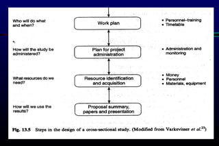This document provides an overview of cross-sectional studies. It defines cross-sectional studies as studies that measure prevalence by observing exposures and outcomes in a population at a single point in time. It discusses key aspects of cross-sectional study design such as sampling, data collection methods, analysis of prevalence data, and potential biases like selection bias.