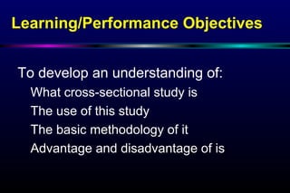 This document provides an overview of cross-sectional studies, including what they are, their uses, methodology, advantages, and disadvantages. A cross-sectional study involves observing a population at a single point in time to determine prevalence of disease. It is a quick and inexpensive way to describe characteristics of a population and identify associations between variables. However, it cannot determine causation due to its observational nature.