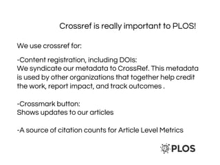 This document discusses Crossref's importance to PLOS and how they use Crossref features. PLOS uses Crossref for content registration including DOIs, the Crossmark button to show article updates, and as a source for citation counts. PLOS has registered over 264,000 article DOIs and over 4 million component DOIs with Crossref. The document also lists some desired improvements like better support for component DOIs and the peer review deposit schema.