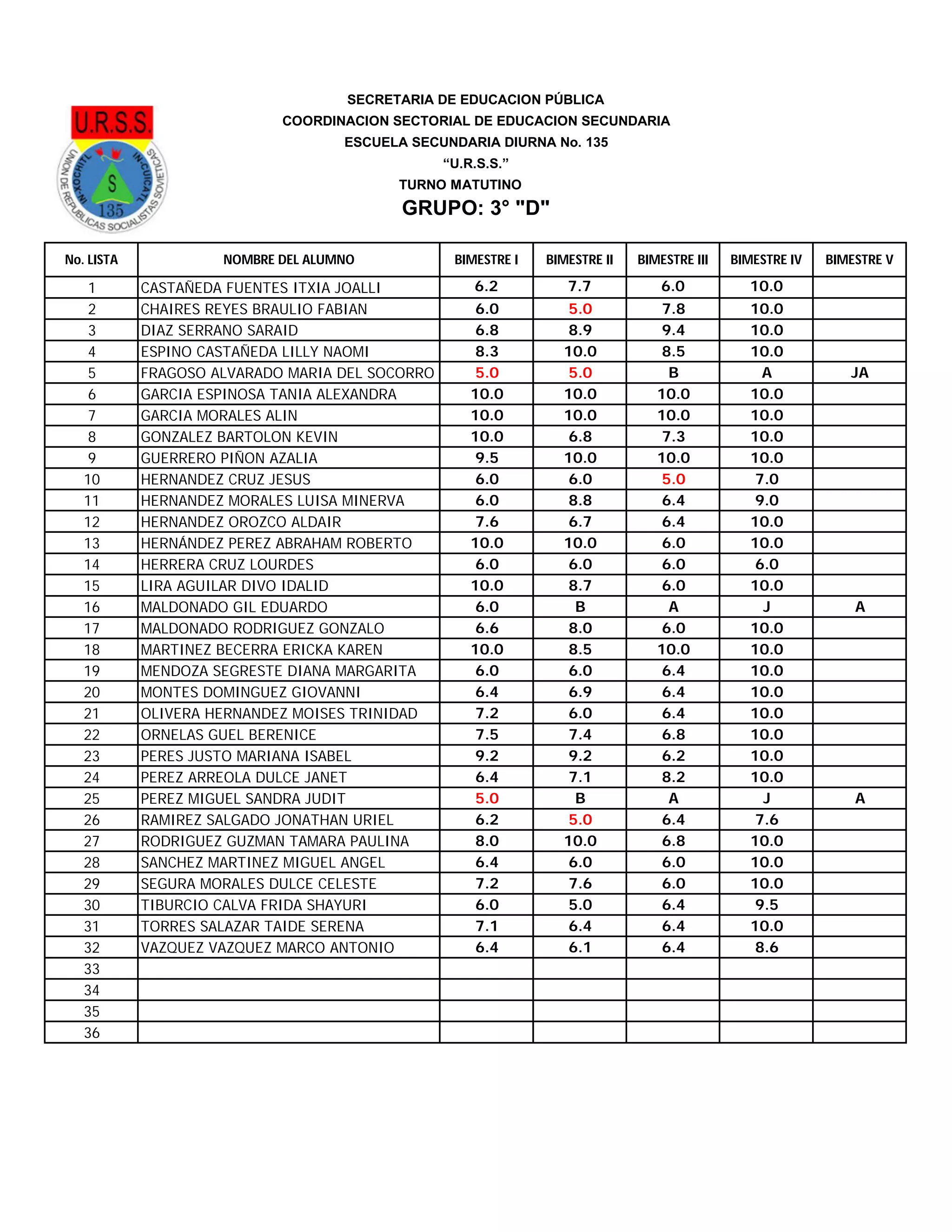This document contains a table listing the names of 35 students in group 3° "D" of Escuela Secundaria Diurna No. 135. It includes each student's grades over 5 bimesters (quarters) in their various classes. Some common features are that most students' grades improved over time, ranging from 5.0 to 10.0, with a few students receiving a "BAJA" mark at some point. The document also provides the school name and indicates this is for a morning shift program.