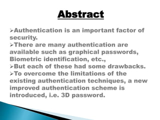 This document proposes a new authentication scheme called 3D passwords. It summarizes some limitations of existing authentication techniques like textual passwords and graphical passwords. 3D passwords aim to overcome these limitations by combining recognition, recall, tokens, and biometrics into a 3D virtual environment where a user's interactions with objects constitute their unique password. The proposed 3D password scheme provides advantages like flexibility, strength, and ease of memorization compared to other authentication methods.
