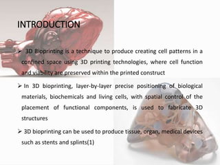 3D bioprinting is a technique that uses 3D printing technologies to precisely position biological materials, cells, and biochemicals in layers to fabricate 3D structures and tissues. The process involves imaging tissues to create digital models, selecting appropriate biomaterials, cell sources, and a bioprinting method (inkjet, microextrusion, or laser). Applications include producing skin, blood vessels, and other tissues for implantation and drug testing. However, fully functional 3D printed organs are still in development due to challenges with vascularization and matching native tissue complexity.