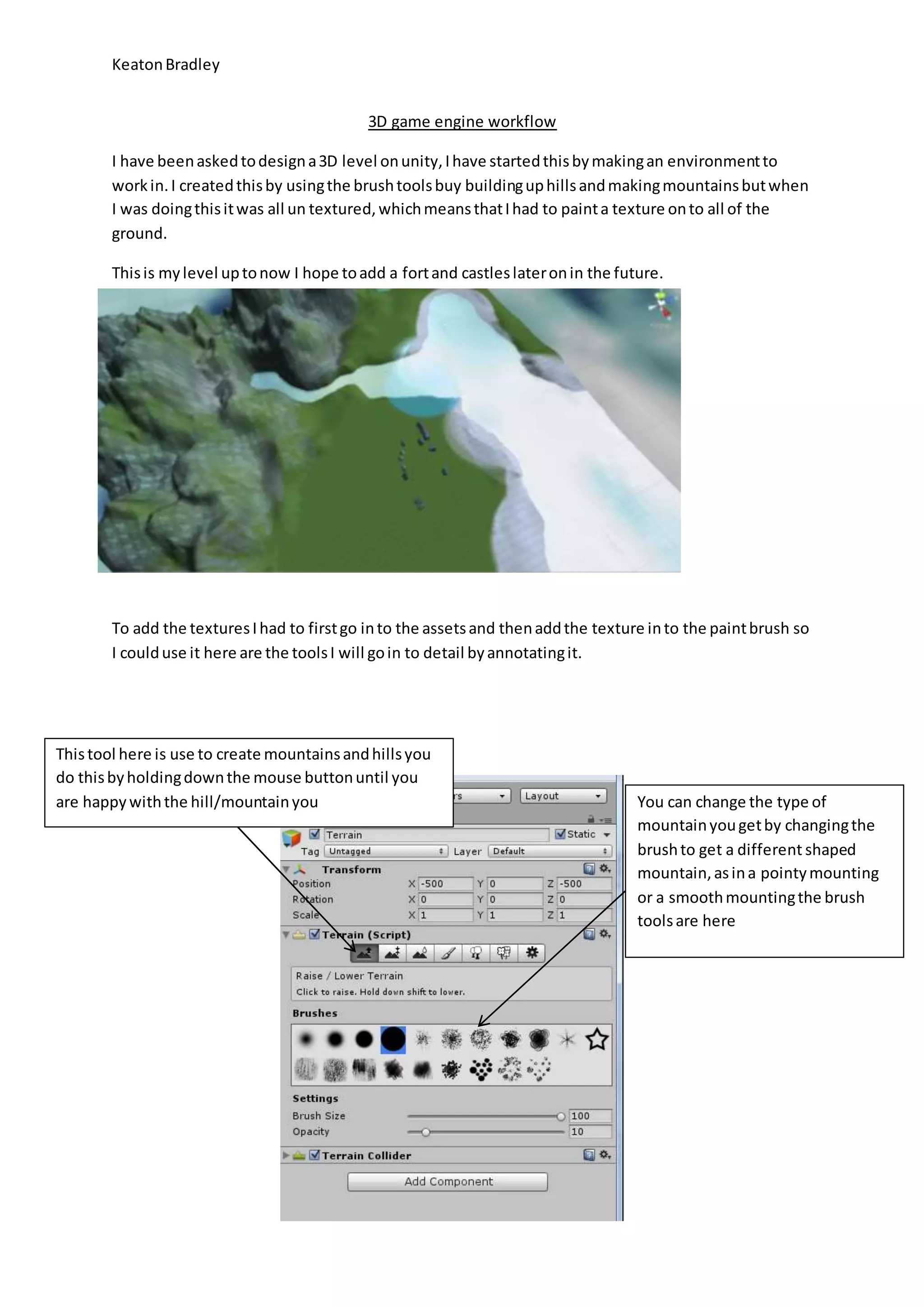 Keaton describes their process of designing a 3D level in Unity. They began by using brush tools to create hills, mountains and terrain without textures. Keaton then added textures to the terrain using tools in the assets menu and paint brush. Additional elements like water were created using planes and multiple textures. Keaton shares the tools available for sculpting terrain, placing trees and other assets, and adding colliders to prevent players from passing through objects. A castle asset was downloaded from the asset store and trees in the courtyard were given mesh colliders.