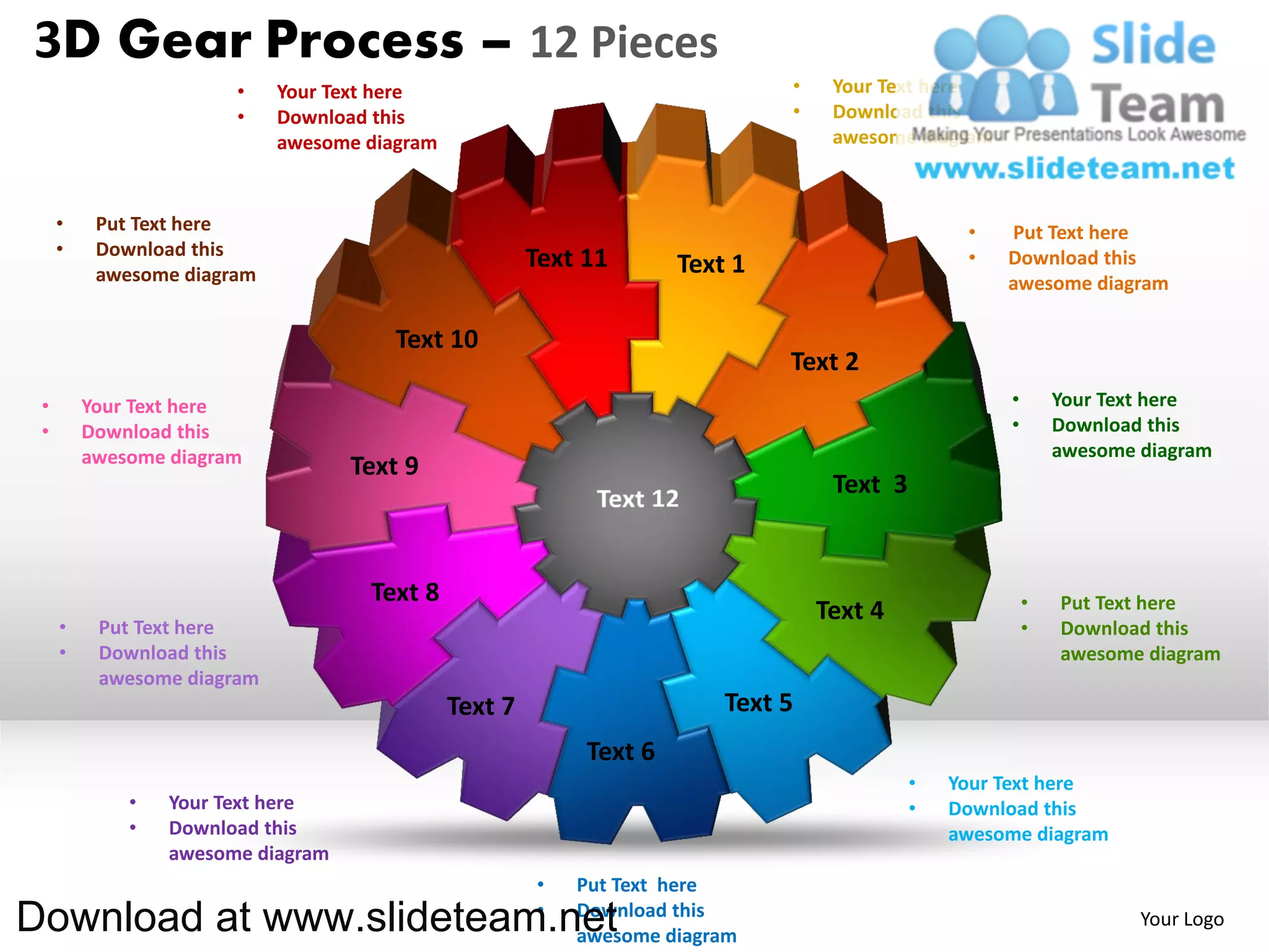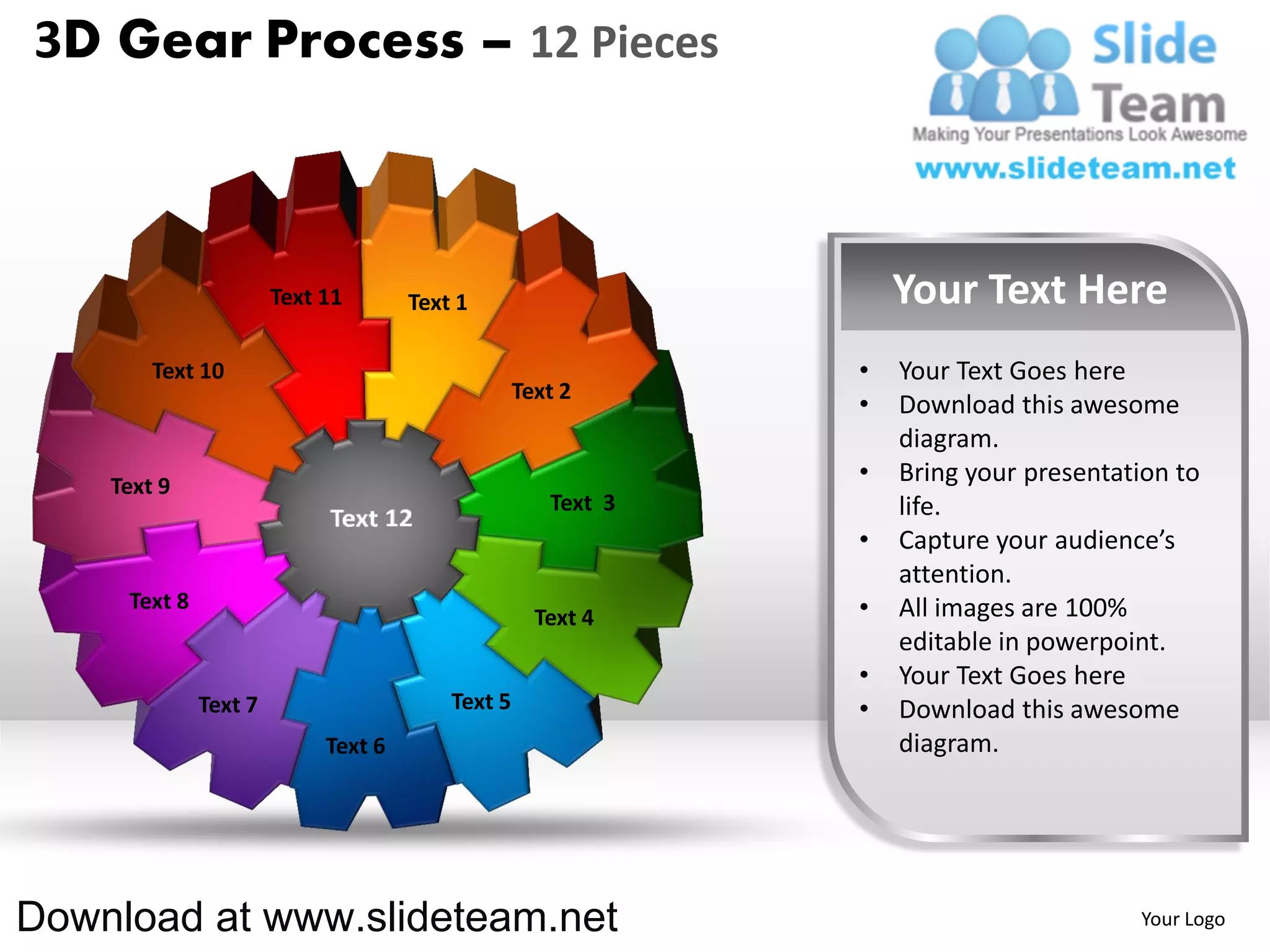 The document provides instructions for editing a 3D gear diagram PowerPoint slide. It includes 12 text boxes that can be customized with user text. The diagram and all images are fully editable and customizable to change color, size, orientation or text. Users can ungroup objects, select individual shapes, and format colors to customize the slide for their own presentations.