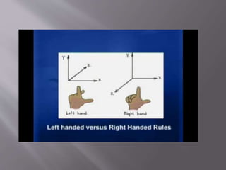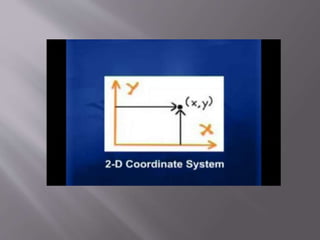Human eyes perceive 3D projections in 2D. Coordinate systems including 1D, 2D, and 3D Cartesian systems define locations using reference points and orthogonal axes. 3D systems use x, y, and z coordinates to locate points and define geometries in space, including volumes like cubes and spheres. Coordinate transformations allow changing between reference frames.
