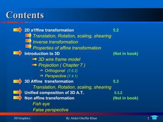 1. 2D affine transformations like translation, rotation, scaling and shearing and their properties such as preserving lines and ratios.