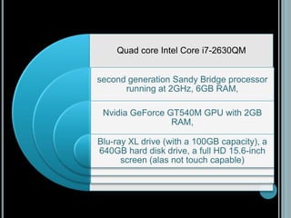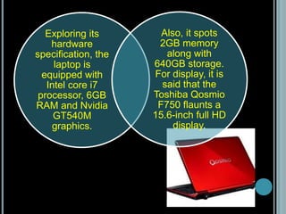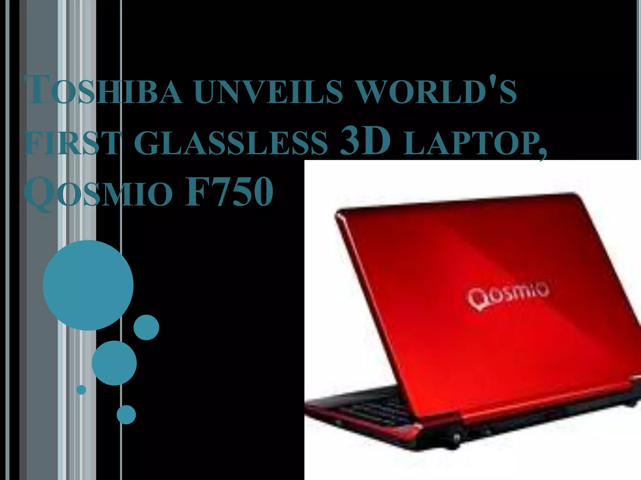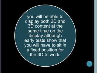 Toshiba unveiled the world's first glassless 3D laptop, the Qosmio F750. The F750 uses a webcam to track the user's eye position and displays slightly different images to each eye to create a 3D effect without glasses. The document then provides background information on 3D technology, explaining the different methods humans use to perceive depth like stereoscopic vision, accommodation, parallax, size familiarity, and aerial perspective. It discusses how 3D is simulated on 2D screens using techniques like anaglyph, polarized light, and active shutter glasses.