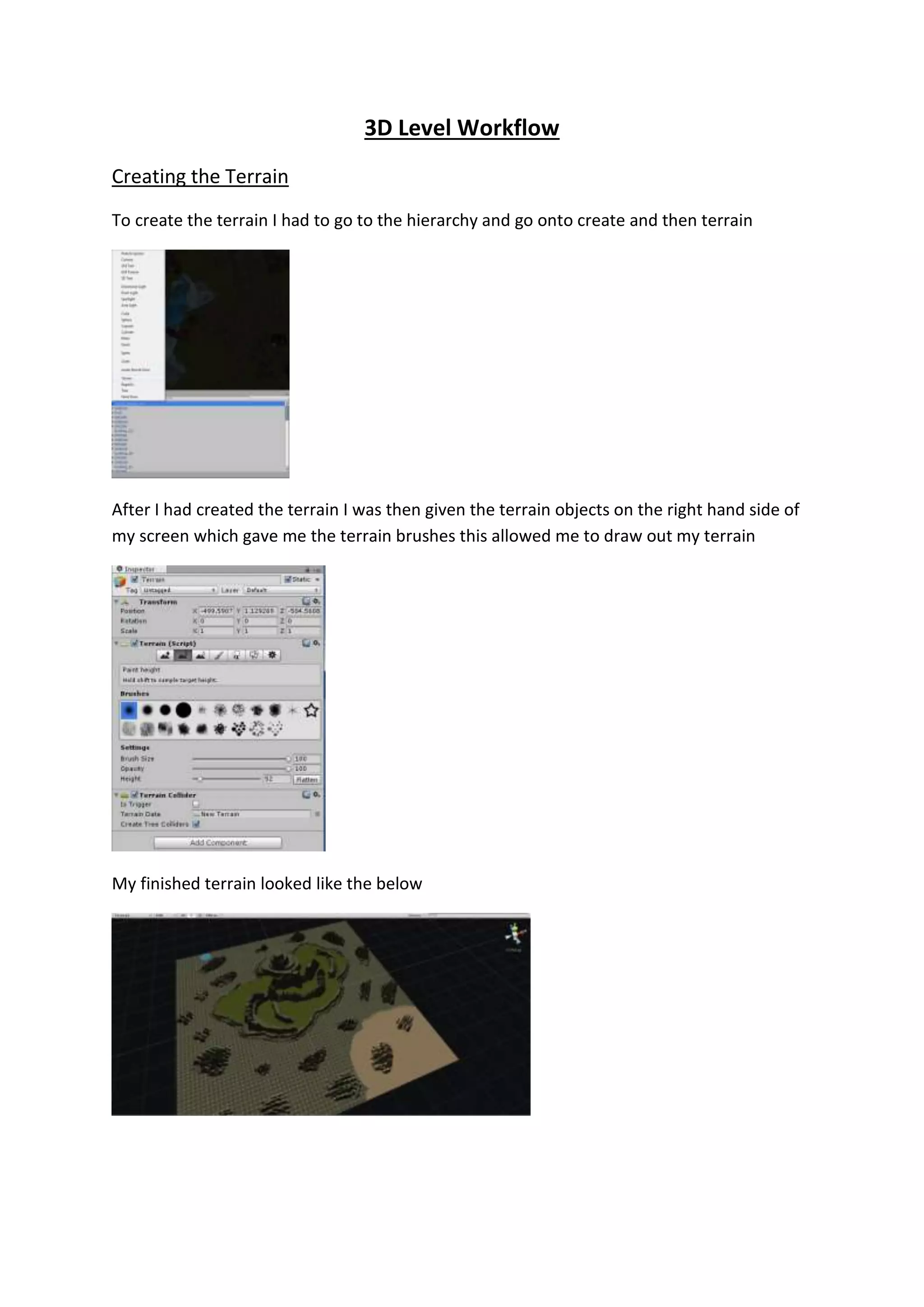 The document describes the steps taken to create a 3D terrain for a game level. It involves: