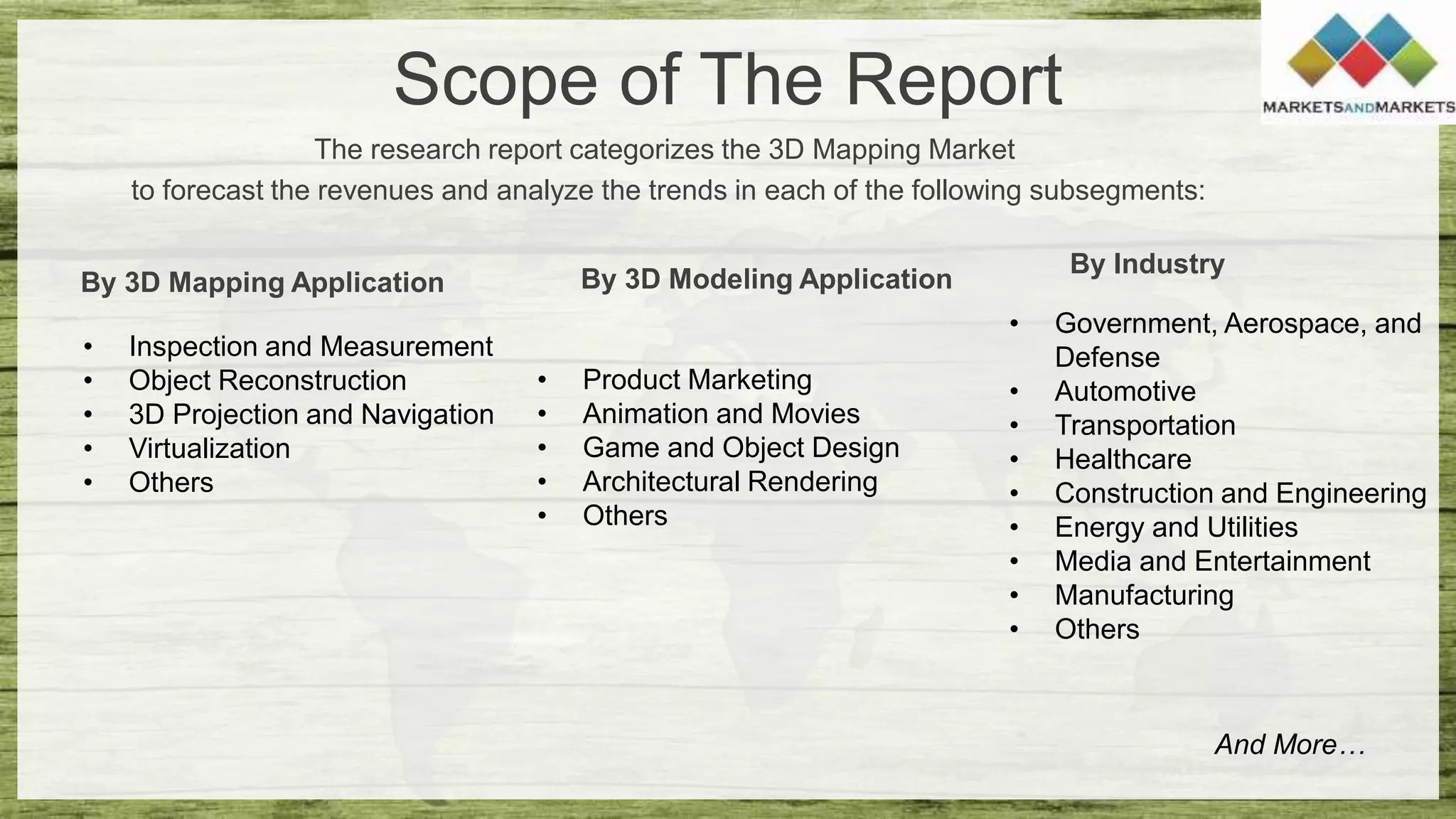 The 3D mapping and modeling market is projected to reach $6.5 billion by 2023, growing at an 18.0% CAGR from $2.8 billion. Key segments include government, automotive, healthcare, and applications such as inspection, product marketing, and architectural rendering, with North America expected to hold the largest market share. The report provides insights on market trends, competitive landscape, and opportunities for growth across various regions.