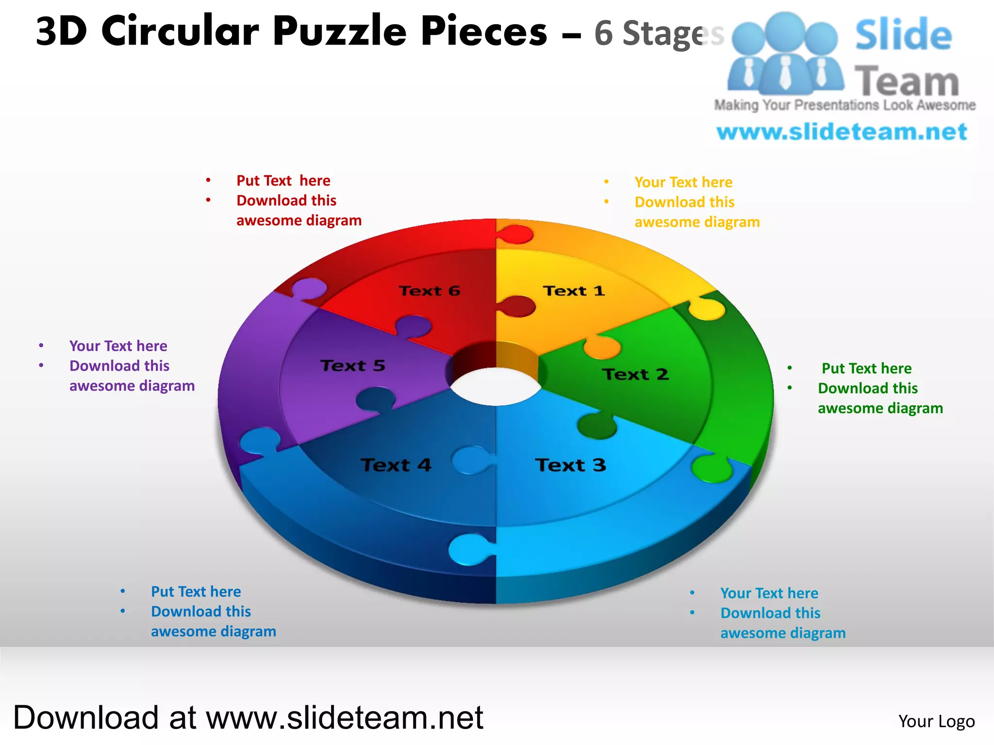 The document describes a set of 6 circular puzzle piece diagrams that can be downloaded and edited in PowerPoint. The diagrams allow users to customize text, change colors, sizes and orientations of icons. Individual puzzle pieces can be ungrouped for further editing. All images are fully editable to bring presentations to life and engage audiences. The diagrams can be downloaded from a provided website URL.