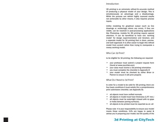 This document provides guidance on 3D printing at CityTech, including an introduction to 3D printing, eligibility requirements, model requirements, and instructions for preparing models in Rhino for 3D printing. Key steps include ensuring models have unified surface normals, a minimum thickness of 1/8", are watertight with no gaps or holes, and are exported as an STL file with a tolerance of 0.001 inches for 3D printing. The document provides tips for adding thickness, checking and repairing meshes, exporting models, and optimal Rhino settings for 3D printing models.