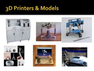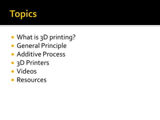 3D printing is an additive manufacturing process where a three-dimensional object is created by laying down successive layers of material under computer control. It builds an object from a digital file describing its shape in thin cross-sections. The 3D printer reads this file and deposits layers of material one by one until the object is completed. Common materials used include plastics, metals, ceramics, and edible substances. 3D printing offers advantages over traditional manufacturing as it enables the creation of complex geometries and customized parts.