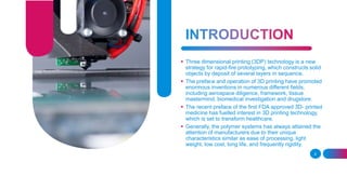 The document discusses three-dimensional printing (3D printing) technology, highlighting its transformative potential in various fields, especially healthcare, due to recent FDA approvals and advancements. It covers different 3D printing methods, including SLA, DLP, and FDM, and their applications in rapid prototyping, personalized medicine, and drug delivery. The benefits of 3D printing include cost efficiency, customization, complex fabrication capabilities, and innovative dosage forms, which are set to revolutionize the pharmaceutical industry.